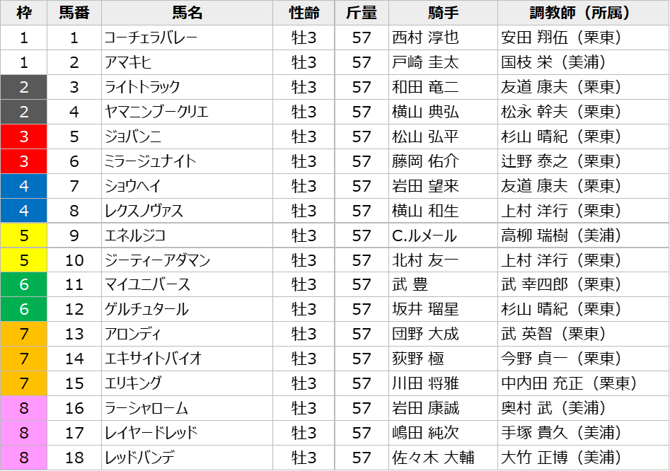…前哨戦を完勝。能力は世代最上位級だが、舞台替わり3000mでの立ち回りとコース取りに“未知”。外を回すロスが出ると一枚割引に。